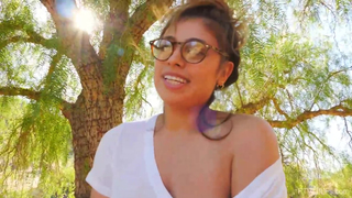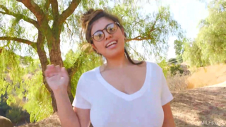 Big titted brunette, Ella is displaying her milk jugs in a public place, during the day