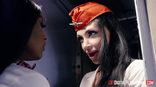 Hot black babe Jai James and the stunning curvy bimbo Aletta Ocean are the best air attendants in the business! They not only serve all passengers in a perfect manner, they also enjoy serving the pilots of they planes they fly on! These two hotties enter the pilot's cabin with all their curves and sex appeal and quickly find out why they call it a cockpit!