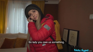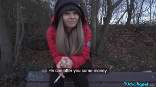 We saw this gorgeous dirty blonde sitting on a park bench having a smoke, so Martin and I walked up and introduced ourselves. Dominno told us she was thinking, and revealed her husband had confessed to an affair and recently kicked her out. She was open to our help, and agreed to flash me for 4000 CZK. We invited her back to a hotel room, and man, they were way bigger than I thought! The thirsty Dominno had huge boobs, so I asked if she'd let me tit-fuck her for 10000. She took a shower, then put my cock between her jugs. She gave me a blowbjo next, then let me fuck her tight pussy. I made her cum a few times, then pumped a load onto her huge boobs!