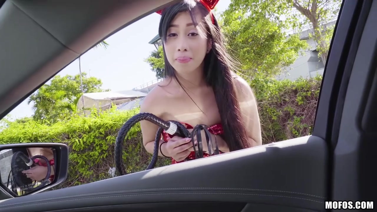 Sweet little devil Jade Kush is dressed up for the big party, but she has to hitch-hike. Her outfit is a good hook, but to get a ride 40 minutes away, she'll have to give something more. Good thing she's got a banging set of big Asian tits to flash for the ride, then she earns 5 more minutes ride with a blowjob, choking on the guy's prick proving she's a hell of a devil. She finally gets her ride with hardcore public sex and a huge load of spunk on her naughty face.