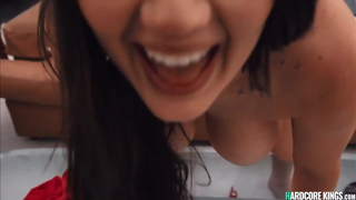 Huge boobs brunette babe Alyx Star in red lingerie having fun arond the Christmas Tree then sucking and fucking thick dick POV in various positions
