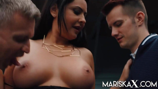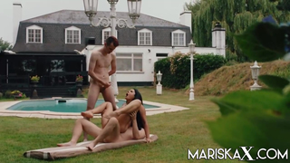 Mariska is getting fucked in the middle of the day, by two guys at the same time